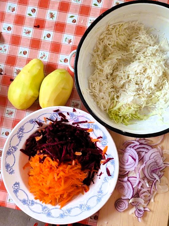 Adjuk hozzá a levétől kinyomkodott káposztát, fonnyasszuk azt is egy kicsit, majd mehet bele a cékla és a sárgarépa. Pirítsuk össze egy kicsit, majd öntsük fel a tisztított vízzel és kezdjük el forralni. |